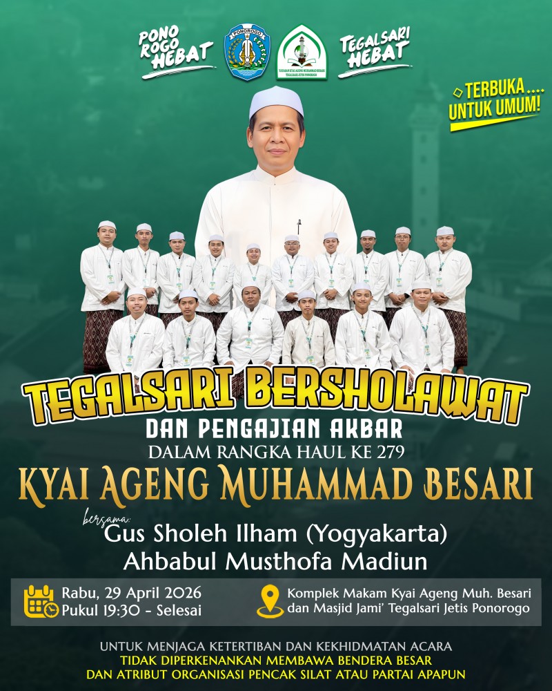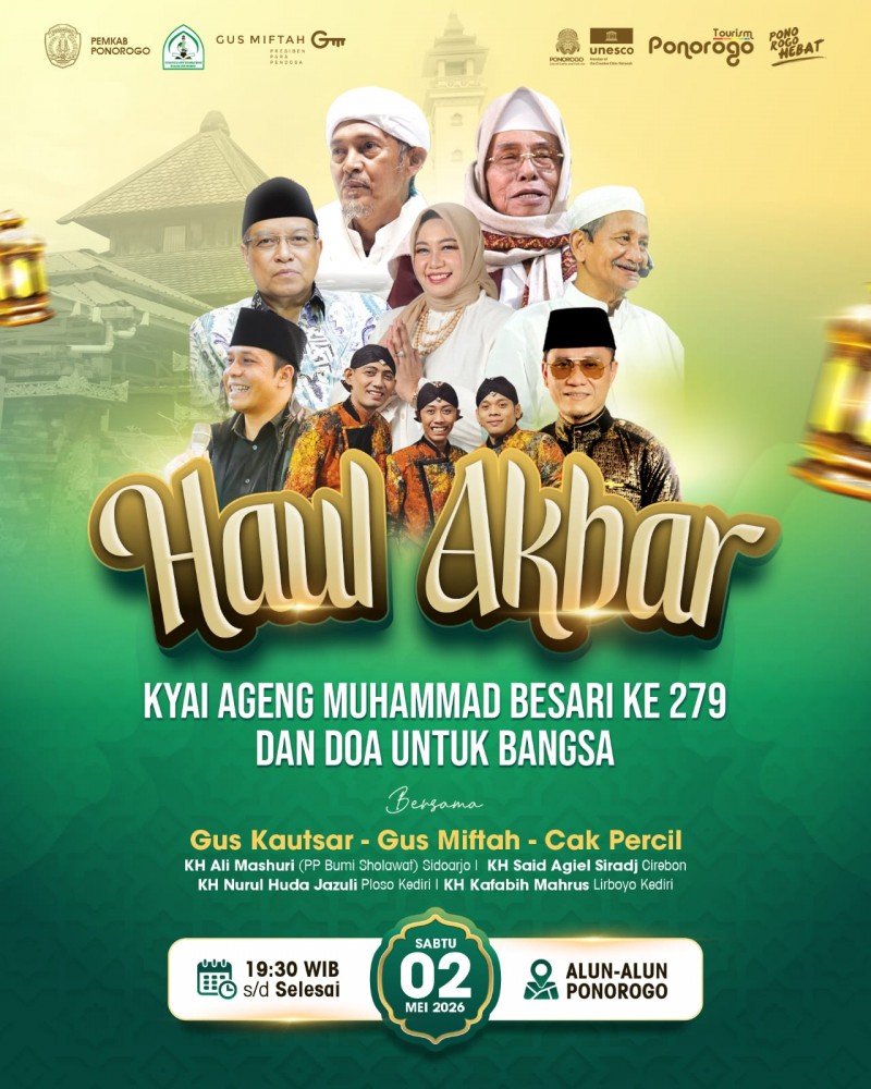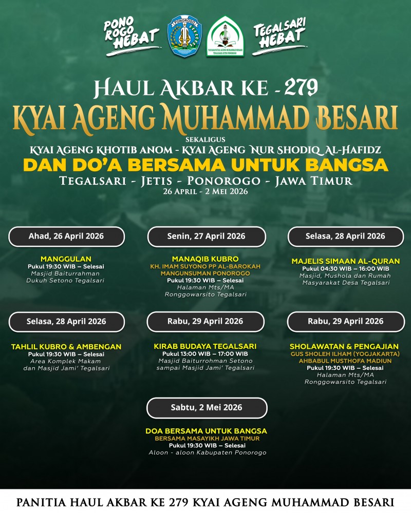 Masyarakat Kabupaten Ponorogo, Jawa Timur, bersiap menyambut pelaksanaan Haul Akbar ke-279 Kyai Ageng Muhammad Besari yang akan digelar pada 26 April hingga 2 Mei 2026 di kawasan Tegalsari, Jetis. Kegiatan tahunan ini diprediksi kembali menyedot ribuan jamaah dari berbagai daerah di Indonesia.