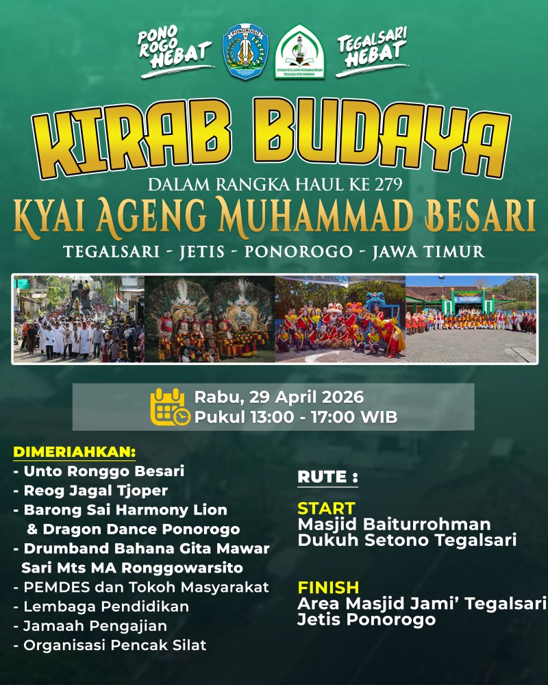 Kegiatan berlanjut pada Rabu (29/4) dengan kirab budaya Tegalsari yang menampilkan kekayaan tradisi lokal. Pada malam harinya, acara sholawatan dan pengajian akan menghadirkan Gus Sholeh Ilham dari Jogjakarta dan Ahbabul Musthofa dari Madiun.